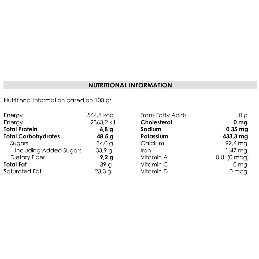 - Coating: Dark chocolate 54% cocoa (Sugar, cocoa mass, cocoa butter, emulsifier (soy lecithin)). Centre: Roasted cocoa nibs, and polishing agent (Gum arabic).